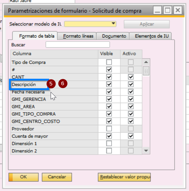 - Visualizaremos una ventana cuyo nombre es "Parametriaciones de formulrio", seguido de módulo correspondiente, en este caso, "Solicitud de compra".