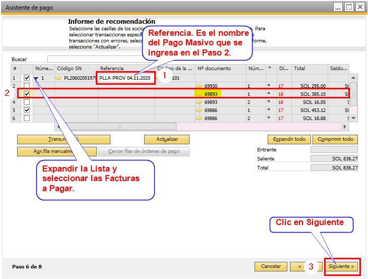 - Expandir la lista para seleccionar y verificar el Nro. del Documento o Factura a pagar