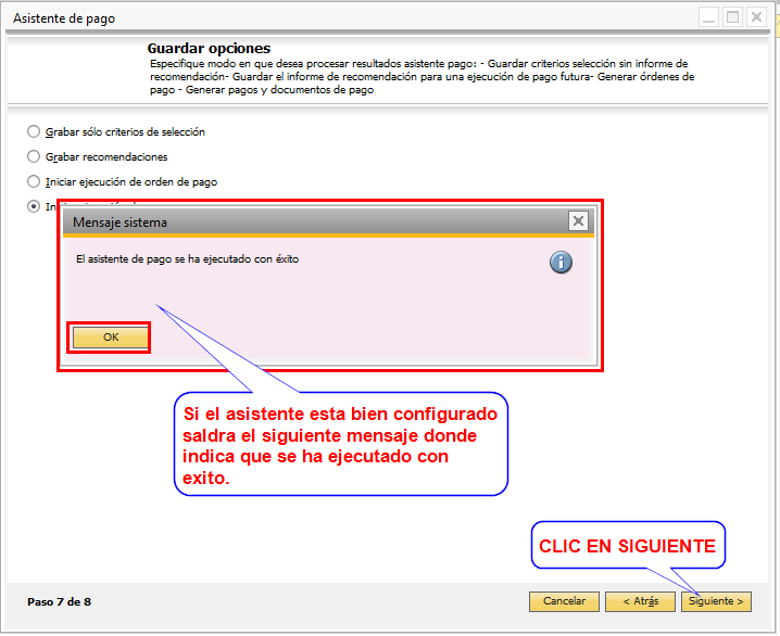 - El Asistente de Pago permite generar pagos en lotes como trasferencias bancarias, cheques o efectos, de acuerdo con transacciones abiertas seleccionadas de proveedores, y vías de pago seleccionadas. Este asistente de Pago se divide en 8 pasos y son los siguientes.