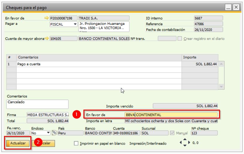 En la ventana Cheques para el pago, campo "En Favor de" deberá cambiar el nombre del proveedor por el nombre del banco a emitir.