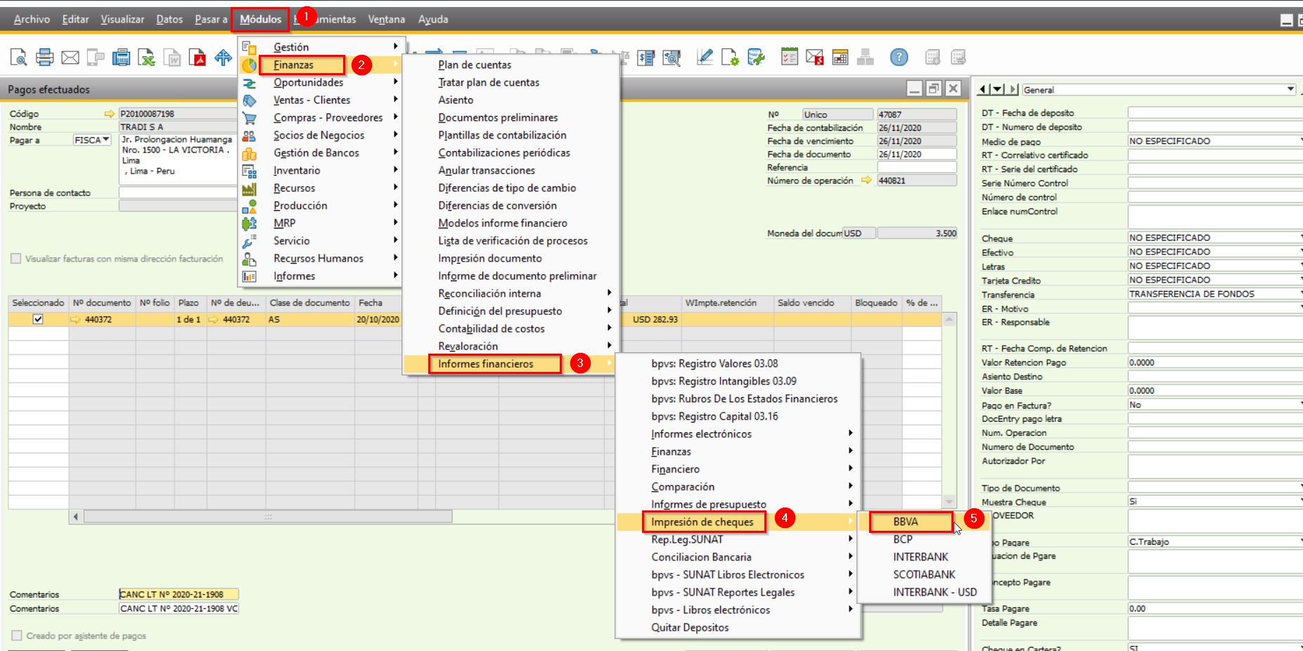 Para el pago de letras con cheque deberá ingresar al Modulo SAP > Gestión de Bancos > Pagos Efectuados