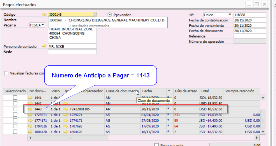 - Al seleccionar el proveedor listara los registros pendientes por pagar, donde la Columna Clase de Documento mostrara el tipo de documento creado ejemplo.