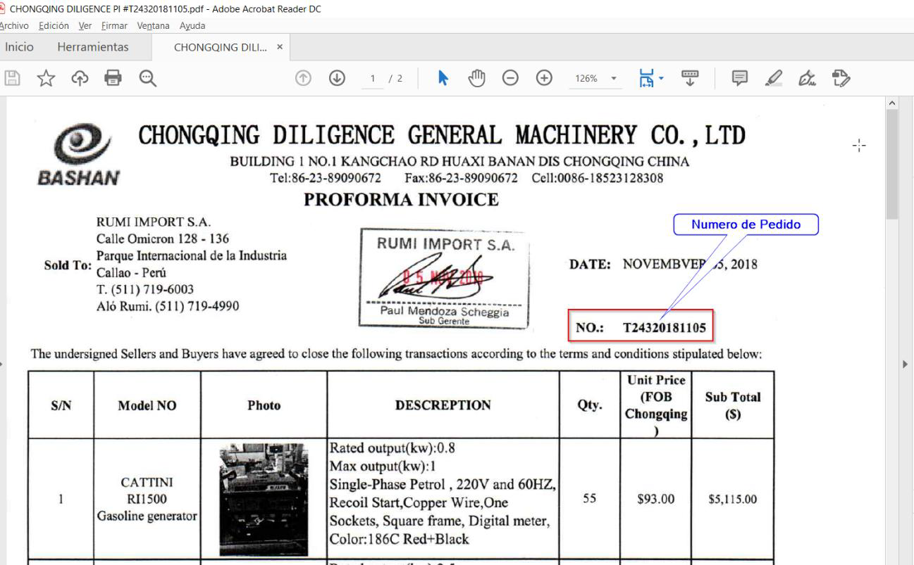 - Al darle Clic en Visualizar se ejecutará la vista preliminar del documento adjunto (Proforma) donde podrá visualizar el Número de Proforma, Monto Total y sus cuentas bancarias del proveedor extranjero.
