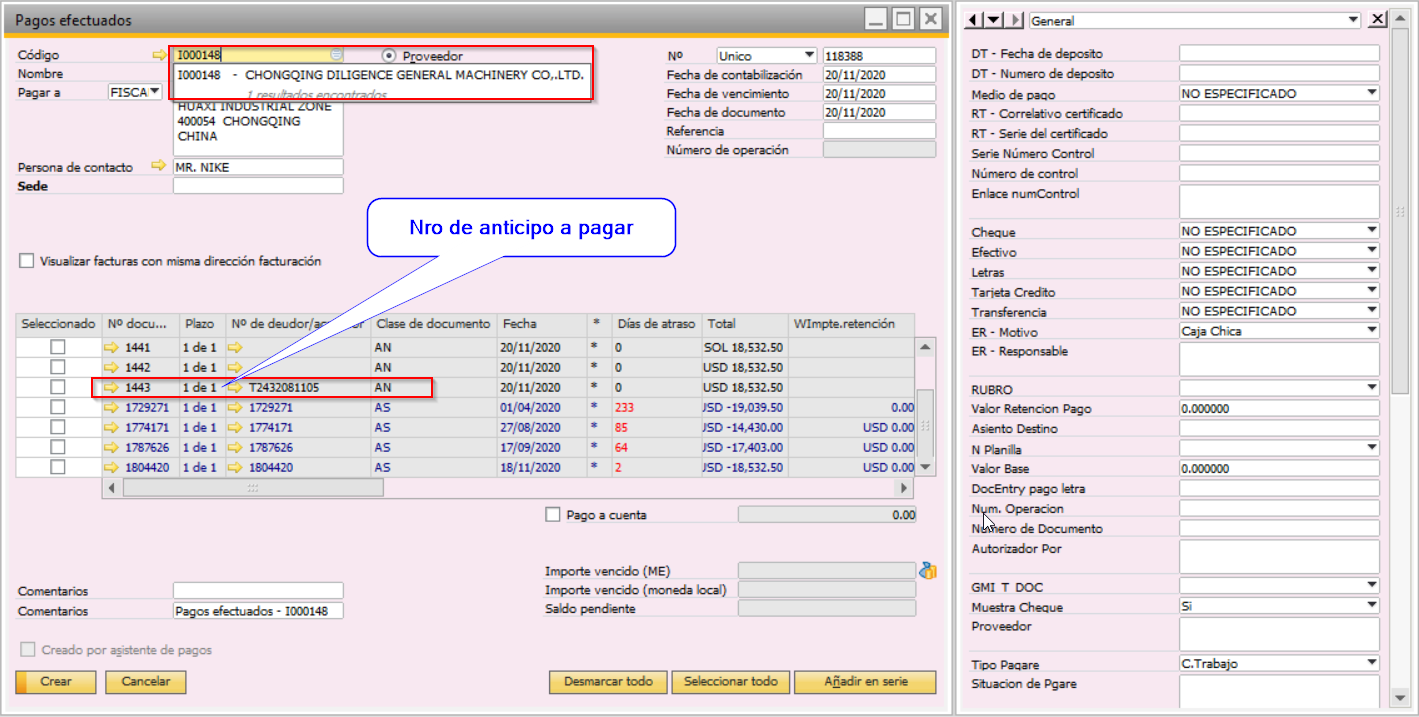 - Ingresamos los datos del Proveedor, para este ejemplo realizaremos el pago al proveedor I000148 “CHONGQING DILIGENCE GENERAL MACHINERY CO.LTD.”