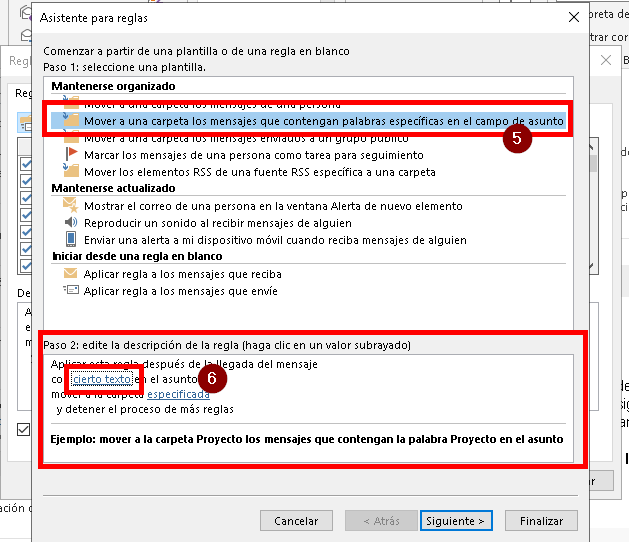 3. Seleccionamos la plantilla para mover los correoscon un asunto específico a una carpeta especìfica. (caso 2)